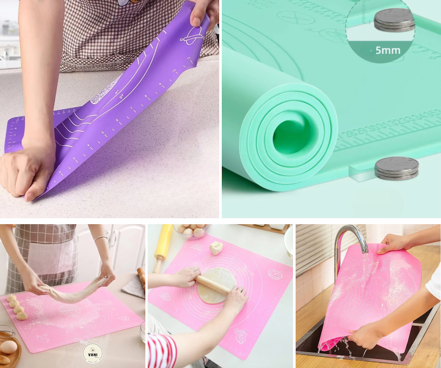| Ứng dụng | Ngoài việc dùng để nhào bột, tấm lót bột silicon còn có thể dùng làm thảm nướng bánh, giúp việc nướng bánh trở nên dễ dàng và tiện lợi hơn |